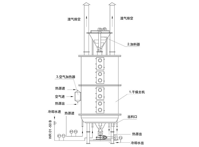 a、常壓型:由于設(shè)備內(nèi)氣流速低,而且設(shè)備內(nèi)濕度分布上高下 低,粉塵很難浮到設(shè)備頂部,所以頂部排濕口排出的尾氣中幾乎不含有粉塵。
